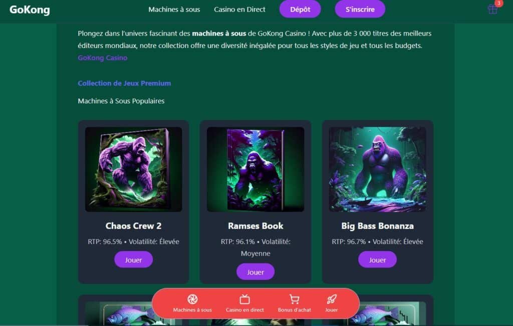 Sur Go Kong Casino, la diversité prime ! On retrouve plus de 1 500 options incluant des machines à sous classiques et modernes 🎰, des jeux de table comme la roulette et le blackjack 🃏, ainsi que des jeux instantanés. Cette large gamme satisfera aussi bien les novices que les joueurs aguerris.