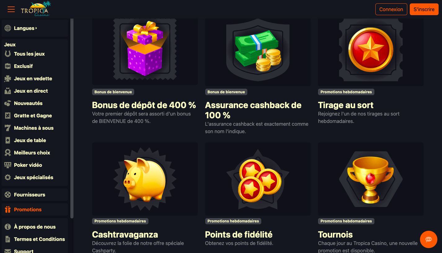 Tropica Casino s’adresse aussi à celles et ceux qui souhaitent rompre avec la routine. Des jeux spéciauxsont régulièrement mis en avant, comprenant des cartes à gratter, des titres de keno ou encore du bingo. Ces modes alternatifs offrent des pauses rafraîchissantes entre deux spins ou mains de vidéo poker.